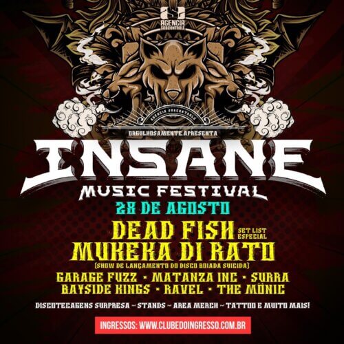 A realização é da Agência Sobcontrole. Os ingressos são limitados, compre aqui: https://www.clubedoingresso.com/evento/insanemusicfestival. O 2º Insane Music Festival será palco de um retorno triunfal há tempos aguardado pelos fãs de punk/hardcore. É o evento escolhido pela icônica banda Mukeka di Rato fazer o show de retorno, após cinco anos parados, que ainda celebrará o lançamento do disco Boiada Suicida, previsto para sair próximo à data do fest. O Mukeka, formado em 1995 na cidade de Vila Velha (Espírito Santo) e cujo baixista/vocalista é o ilustre Fabio Mozine (também da Laja Records), é conhecida pelo humor sarcástico, bases pesadas e vocais velozes. Outro show especial nesta segunda edição do Insane, que terá mais de oito horas de música, é outra renomada banda capixaba: Dead Fish. O headliner do fest, há tempos uma das formações mais destacadas em todo o Brasil em se tratando de punk/hardcore consciente e desafiador, promete um set list especial, exclusivo para esta apresentação. Mas além dos prometidos shows emblemáticos de Mukeka di Rato e Dead Fish, o 2º Insane Music terá outras seis bandas de destaque no cenário nacional, nomes que já romperam nichos e estão cada vez mais no radar do público do rock/punk/hardcore. O icônico Garage Fuzz está em um momento ímpar nos mais 31 anos de carreira. Com novo vocalista (Victor Franciscon, ex-Bullet Bane) e uma sequência ovacionada de shows, a banda santista vem ao Insane com seu hardcore melódico turbinado e ávido por interação intensa do público. Outra banda confirmada no fest que está a todo vapor é o Matanza Inc., formado em 2019 por ex-integrantes do Matanza. Ao vivo, o quarteto é ainda mais robusto e pesado. No bloco do peso, tem também o power trio santista Surra e seu único thrashcore cativante e crítico, com um invejável currículo de shows Brasil afora em questão de uma década em pulsante ativa. O hardcore está muito bem representado ainda com o feroz Bayside Kings, o quarteto santista que modernizou seu estilo no mais recente registro, Existência, cantando em português e trazendo elementos new school do HC à sonoridade. Mais duas bandas completam o altivo line-up do 2º Insane Music Festival: os paulistanos do Ravel, da nova safra que mistura rock alternativo e hardcore com melodias e muita reflexão, e as power trio feminino The Mönic: peso, bpm’s acelerados, vocais rasgados e melódicos são as marcas registradas da banda que te faz viajar diretamente para os anos 90. Além do shows, o festival terá discotecagem surpresa, extensa área de merch, diversos stands de marcas variadas, tattoo e muito mais. |