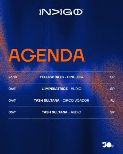 O ecossistema ÍNDIGO estreia com alguns shows já anunciados. Eles dão uma amostra da variedade de sons e estilos que podem caber dentro da proposta da label. São eles: o britânico Yellow Days sobe ao palco no dia 23 de outubro, no Cine Joia; os franceses da L’Impératrice tocam no dia 4 de novembro, na Audio, em São Paulo; e duas performances de Tash Sultana, da Austrália, acontecem nos dias 4 e 5 de novembro, no Circo Voador e na Audio, no Rio de Janeiro e em São Paulo, respectivamente. Todas as datas anunciadas ainda têm ingressos disponíveis pelo site da Eventim (acesse aqui).
