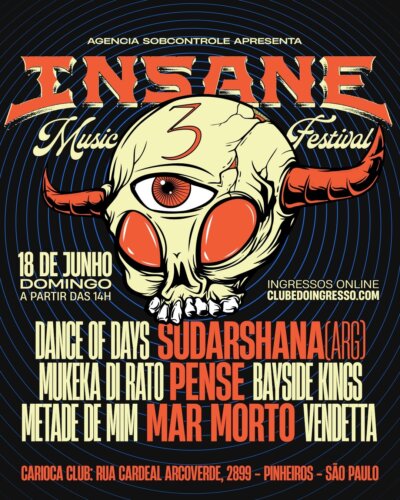 As atrações são Dance Of Days, Sudarshana (Argentina), Mukeka Di Rato, Pense, Bayside Kings, Metade de Mim, Mar Morto e Vendetta. Os ingressos já estão à venda: https://www.clubedoingresso.com/evento/insanemusicfestival-3ed Foi no 2º Insane Music Festival que a aloprada e clássica banda capixaba Mukeka di Rato, cujo baixista/vocalista é o ilustre Fabio Mozine (também da Laja Records), fez seu retorno aos palcos em 2022. E tem repeteco no 3º Insane que esta importante banda do hardcore nacional vai fazer mais um show em solo paulista para divulgar o elogiadíssimo novo disco Boiada Suicida. O Dance of Days é outra banda do 3º Insane que está numa ótima sequência de boas apresentações e conquistando novo público, além de tirar de casa aquelas tantas pessoas que nos anos 90 e nas décadas de 2000 e 2010 ficavam alucinadas nos shows potentes do DoD, sempre comandados pela vocalista Nenê Altro, até os dias de hoje com seu poder de cativar plateias. O Pense está com nova formação – o guitarrista fundador Ítalo assumiu os vocais e a banda se mantém no topo do hardcore nacional. Como eles próprios definem, é um momento de redescoberta e renascimento, que será legitimado no palco do Carioca Club no 3º Insane. Da série show imperdível! E tem atração internacional de responsa! É a clássica banda de hardcore/punk argentina Sudarshana, reverenciada em toda América Latina por abraçar a mensagem Hare Krishna. Eles estão de volta após 11 anos longe do palco e passa por São Paulo no palco do 3º Insane. Outra força do hardcore nacional é o Bayside Kings, de Santos, uma das bandas mais ativas do atual cenário. O quarteto continua a saga #livreparatodos e promete músicas novas no palco do 3º Insane, além das recentes – e potentes – composições em português já na boca do povo, dos EPs ‘Tempo’ e ‘Existência’. Representante do rock alternativo, com pitadas de punk e emo, o Metade de Mim recém-lançou a música ‘Vacilo’, que mostra a versatilidade e criatividade do quarteto, um passo adiante do EP ‘Depois de Tudo que eu Passei’, um dos registros mais comentados e vitoriosos do meio de 2022. Banda com um carisma e sensibilidade ímpar! O 3º Insane recebe o hardcore caiçara do Mar Morto, que nasceu em 2013 na Praia Grande (litoral paulista) – show de uma década de atividades! – e marcado pelo vocal feminino melódico de Aline Santos. A discografia contém três EPs e, na estrada, coleciona turnês pelo Sudeste e Nordeste. Vendetta fecha o poderoso lineup da edição 2023 do Insane. A banda do ABC é veterana do hardcore, desde 2015 sendo uma uma válvula de escape para o dia a dia cruel que o capitalismo impõe a todos o proletariado ao redor do mundo com seu som inspirado em Gorilla Biscuits, Bane e Down To Nothing. Já são dois álbuns e turnês pela América do Sul e Europa. SERVIÇO |