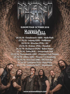 A banda Armored Dawn acaba de confirmar diversas apresentações pela Europa como ‘opening act’ da nova turnê do HammerFall. Os brasileiros vão passar por países como Alemanha, Polônia, Hungria, Bulgária, Grécia, Sérvia, Eslováquia e Áustria, para divulgar o álbum “Barbarians in Black”, lançado pela AFM Records.