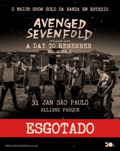 Os fãs aguardam há 11 anos por um novo headline show do Avenged Sevenfold no país e mostraram que a saudade é grande: todos os ingressos para a apresentação do dia 31 de janeiro de 2026, no Allianz Parque, em São Paulo, estão esgotados! Essa volta triunfal tem, ainda, um toque especial já que será o maior show solo da banda em estádio de toda sua carreira, e contará com A Day To Remember e Mr. Bungle como atos de abertura. A turnê Life is But A Dream… — uma realização da 30e, maior companhia brasileira de entretenimento ao vivo — passa também por Curitiba, no dia 28 de janeiro de 2026, na Pedreira Paulo Leminski, com abertura de Mr. Bungle, e tem poucos ingressos disponíveis no site da Eventim (acesse aqui).