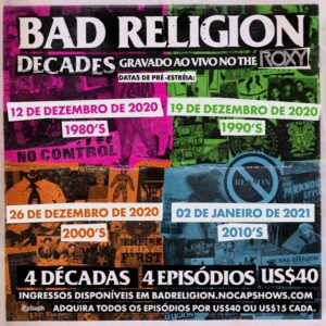 Os 40 anos do Bad Religion serão comemorados em uma série de eventos online transmitidos via streaming e divididos em quatro episódios filmados no lendário The Roxy, em Los Angeles, Califórnia.
