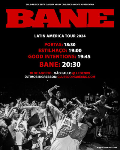 A Solid Music Entertainment traz para o Brasil a lenda do hardcore, Bane. Será um show único no Brasil, em São Paulo, no dia 10 de agosto. A abertura fica por conta da Estilhaço e Good Intentions.