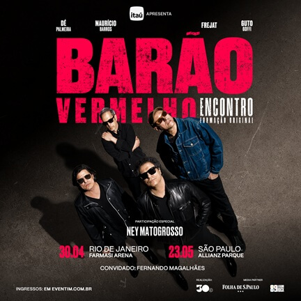 Quando o jornalista e produtor Ezequiel Neves ouviu a primeira fita do Barão Vermelho, ele sentenciou: “É rock puro, escrachado e demencial, imperfeito e carnívoro. Trombetas selvagens anunciando o começo de um novo mundo”. Ao emoldurar o sentimento de rebeldia e liberdade dos anos 1980 com a “voz de Cazuza cuspindo fogo em doses avassaladoras” (como bem disse Ezequiel), o grupo revolucionou o cenário musical da época. As canções, com poesia e irreverência, deram conta de se tornar a trilha sonora de um país complexo como o Brasil. E ultrapassaram gerações pela atemporalidade das letras. Agora, começa a turnê Barão Vermelho Encontro – Pro Mundo Inteiro Acordar que reúne a formação original do grupo: Roberto Frejat (guitarra e voz), Guto Goffi (bateria), Mauricio Barros (teclados) e Dé Palmeira (baixo) – e terá ainda como convidado especial o guitarrista Fernando Magalhães, que ingressou no grupo em 1985. Realizada pela 30e, maior companhia brasileira de entretenimento ao vivo, e apresentada pelo Itaú, a turnê tem as seguintes datas confirmadas: 30 de abril, na Farmasi Arena, no Rio de Janeiro; e 23 de maio, no Allianz Parque, em São Paulo. Nas duas cidades, o Barão Vermelho Encontro recebe a participação de Ney Matogrosso. A pré-venda exclusiva para clientes do Itaú tem 15% de desconto no valor dos ingressos e começa no dia 12 de dezembro, às 15h; a venda geral começa ao meio-dia do dia 15 de dezembro, pelo site da Eventim (acesse aqui).