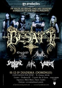Os poloneses do Besatt se apresentam em Diadema/SP, neste domingo (01/12), no Container Pub Stop (Rua Orense, 60-66, Centro, Diadema). No evento estarão além do Besatt, as bandas Spiritual Hate, Empire Of Souls, Absyde, Vulture e Ahiag. A tarde de Metal extremo começa a partir das 15h.