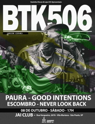 Atrações nacionais no show de São PauloPauraClássica banda de hardcore baseada na cidade São Paulo, o Paura resiste no underground há mais de 25 anos. Sempre musicalmente atual e afiado em seu conteúdo lírico, mais uma vez o Paura vem mostrar que hardcore também é coisa de gente grande. Good IntentionsOs veteranos do straight edge vêm outra vez mais nos mostrar que hardcore é mais que música. Posturado e alerta, o Good Intentions sempre foi sinônimo de apresentações catárticas. Uma banda que se consolidou no underground sem jamais esquecer de seus ideais. EscombroA banda mais pesada da cidade ataca novamente. Com guitarras ultrapesadas e letras agressivas, com mensagens críticas, o Escombro ganhou notoriedade na cena ao longo dos últimos anos. Unindo a estética do hardcore a citações famosas no mundo do rap, o Escombro é uma ode ao que há de mais sincero no submundo. Never Look BackO Never Look Back é a força do hardcore/metal de Brasília. A banda ficou cerca de 3 anos longe dos palcos, mas já anunciou que está com gás total para as próximas apresentações, inclusive neste show em São Paulo. |