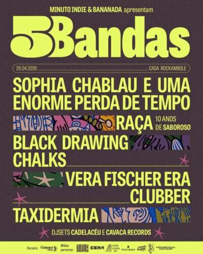 O retorno dos goianos do Black Drawing Chalks e a sensação fluminense Vera Fischer Era Clubber completam e finalizam o line-up final da edição especial do festival 5 Bandas em colab com o Bananada. A festa, que acontece no dia 26 de abril, na Casa Rockambole, em São Paulo, ainda traz toda irreverência e energia dos paulistanos Sophia Chablau e Uma Enorme Perda de Tempo, do Raça celebrando 10 anos do disco Saboroso numa despedida dos palcos e do duo baiano experimental Taxidermia, formado por Jadsa e João Meirelles (BaianaSystem). Os ingressos estão disponíveis online.