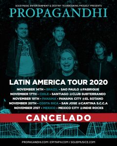 Devido ao Covid, a turnê do Propagandhi que aconteceria em Novembro, está infelizmente cancelada. Era uma turnê muito esperada pelo nosso público e estávamos muito felizes por ela mas infelizmente seria inviável realiza-lá neste momento. Estamos trabalhando para realizar a turnê no primeiro trimestre de 2022.Diretrizes para reembolso: Para reembolso, o pedido deve ser solicitado no site do Clube Do Ingresso usando a opção CANCELAMENTO PROPAGANDHI (COVID – 19).