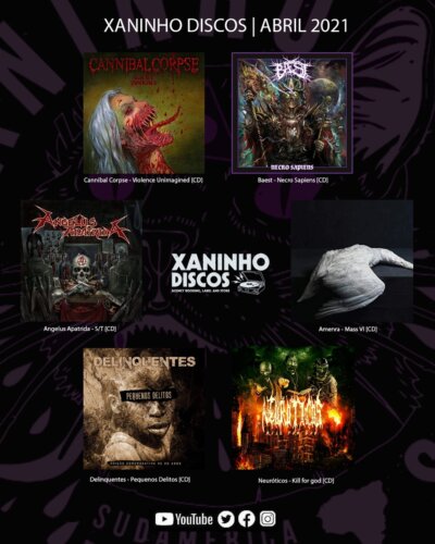 Em abril a Xaninho Discos disponibilizará no mercado brasileiro, os novos álbuns das bandas Cannibal Corpse (Violence Unimagined), Angelus Apatrida (Angelus Apatrida), Baest (Necro Sapiens), Neuroticos (Kill For God) e o relançåmento do Delinquentes (Pequenos Delitos), além da versão em vinil do Baixo Calão (Necrológio).
