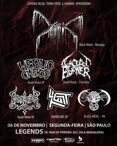 As produtoras Caveira Velha Produções, Xaninho e Tumba prepararam um grande evento de metal extremo que será realizado no dia 6 de novembro na House of Legends. As bandas Mork, diretamente da Noruega, e Goatburner, representando a Finlândia, são as atrações internacionais confirmadas para o festival, que ainda contará com Sodoma, de João Pessoa (PB), e as paulistas Nervochaos, Funeratus e Test. Os ingressos antecipados podem ser adquiridos online através do site da Bilheto.