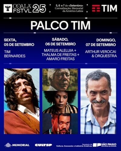 Proporcionar experiências catárticas por meio da música é uma das principais características que coloca o Coala Festival em uma posição singular no circuito do showbiz brasileiro. E o Memorial da América Latina, em São Paulo, colabora com essa narrativa por ser um espaço que preserva momentos vívidos da arte e da cultura nacional. É a partir dessa conjuntura que o festival anuncia as atrações do Palco TIM, uma parceria com a marca de telefonia que se renova pelo segundo ano consecutivo no Auditório Simón Bolívar. Durante o evento, marcado para os dias 5, 6 e 7 de setembro, o público poderá conferir uma programação especial com shows de Tim Bernardes e orquestra, apresentando Um Raro Momento Infinito, na sexta-feira, 5; Arthur Verocai, também com orquestra, no sábado, 6; e a união de Mateus Aleluia, Thalma de Freitas e Amaro Freitas, no domingo, 7. Os ingressos para a 11ª edição do Coala Festival estão disponíveis para compra no site da Total Acesso (acesse aqui).