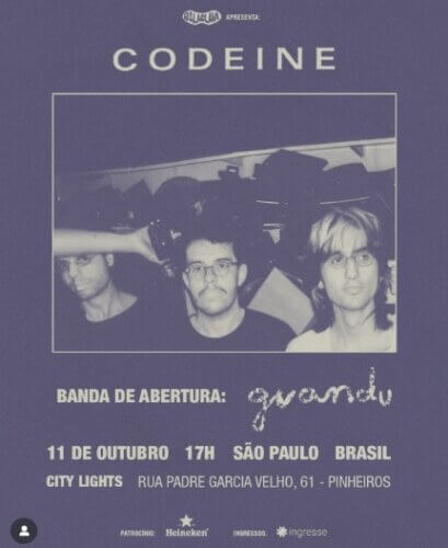 Para tornar a noite ainda mais especial, convidamos a @guandu.br para o show de abertura! A casa abre às 17h, guandu toca 17:50 e Codeine às 19h, pontualmente. Chegue cedo e garanta seu merch 🙂