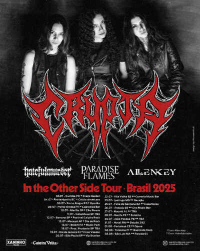 A realização da turnê é da Xaninho Discos em parceria com a Caveira Velha. Esta será a primeira vez que a Crypta excursiona somente ao lado de bandas com vocalistas mulheres. As convidadas especiais ao longo do novo giro brasileiro são Hatefulmurder, Allen Key e Paradise Flames. A In the Other Side Tour marca uma nova fase da Crypta, que está em processo de composição do terceiro álbum da carreira. A previsão é que o novo material de inéditas seja lançado mundialmente no segundo semestre de 2026. Nestes próximos shows, Fernanda Lira (baixo e vocal) e Luana Dametto (bateria) e Tainá Bergamaschi (guitarra) terão a companhia de uma guitarrista convidada. Nos shows na Europa, quem ocupa o posto é Helena Nagagata, conhecida por seu trabalho solo e pelas colaborações com Sinaya e o projeto Shamangra. A In the Other Side Tour passará por Curitiba (PR), Florianópolis (SC), Porto Alegre (RS), Ponta Grossa (PR), Marília (SP), Catanduva (SP), Serrana (SP), Macapá (AP), Belém (PA), Presidente Prudente (SP), Rio de Janeiro (RJ), São Paulo (SP), Vila Velha (ES), Ipatinga (MG), Feira de Santana (BA), Aracaju (SE), Maceió (AL), Recife (PE), João Pessoa (PB), Natal (RN), Fortaleza (CE), Teresina (PI) e São Luís (MA). IN THE OTHER SIDE TOUR • BRASIL 202503.07 • Curitiba PR * Stage Garden https://articket.com.br/e/3813/crypta-em-curitiba 04.07 • Florianópolis SC * Célula showcase https://101tickets.com.br/events/details/Crypta-em-Florianopolis 06.07 • Porto Alegre RS * Opinião https://bileto.sympla.com.br/event/105528/d/315014/s/214461 08.07 • Ponta Grossa PR * Capivaras Bar https://101tickets.com.br/events/details/Crypta-em-Ponta-Grossa 10.07 • Marília SP * Cão Perere https://101tickets.com.br/events/details/Crypta-em-Marilia 11.07 • Catanduva SP Infos em breve. 12.07 • Serrana SP *Festival Caipiro Rock Ingressos Gratuitos. 13.07 • Macapá AP * Dia do Rock Ingressos Gratuitos. 15.07 • Belém PA * Music Park https://101tickets.com.br/events/details/Crypta-em-Belem 18.07 • Pres. Prudente SP Infos em breve. 19.07 • Rio de Janeiro RJ * Circo Voador https://www.eventim.com.br/artist/circo-voador/crypta-no-circo-voador-3722214/ 20.07 • São Paulo SP * Vip Station https://101tickets.com.br/events/details/Crypta-em-Sao-Paulo 22.07 • Vila Velha ES Correria Music Bar https://101tickets.com.br/events/details/Crypta-em-Vila-Velha 23.07 • Ipatinga MG Garajão https://101tickets.com.br/events/details/Crypta-em-Ipatinga 25.07 • Feira de Santana BA Casa Noise https://101tickets.com.br/events/details/Crypta-em-Feira-de-Santana 26.07 • Aracaju SE Che Music Bar https://101tickets.com.br/events/details/Crypta-em-Aracaju 27.07 • Maceió AL TBA https://101tickets.com.br/events/details/Crypta-em-Maceio 29.07 • Recife PE Estelita https://101tickets.com.br/events/details/Crypta-em-Recife 30.07 • João Pessoa PB TBA https://101tickets.com.br/events/details/Crypta-em-Joao-Pessoa 31.07 • Natal RN Galpão 292 https://101tickets.com.br/events/details/Crypta-em-Natal 01.08 • Fortaleza CE Opera https://101tickets.com.br/events/details/Crypta-em-Fortaleza 02.08 • Teresina PI Bueiro do Rock https://101tickets.com.br/events/details/Crypta-em-Teresina 03.08 • São Luís MA Parada 64 https://101tickets.com.br/events/details/Crypta-em-Sao-Luis Com Allen key* Com Hatefulmurder** |