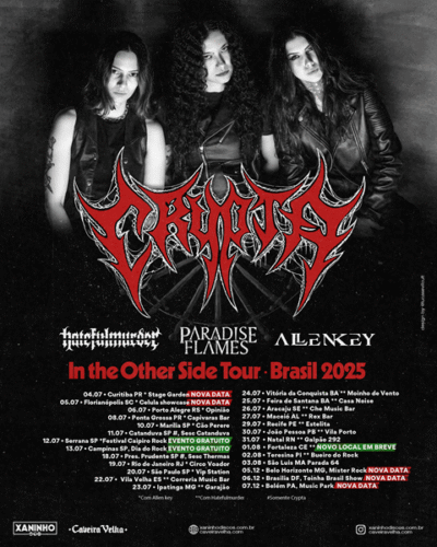 No mês que vem a Crypta iniciará sua tour brasileira, “In The Other Side Your – Brasil 2025”. As bandas Hatefulmurder, Paradise In Flames e Allen Key são as convidadas para os shows (confira nas datas!). As produtoras Xaninho Discos e Caveira Velha (responsáveis por esses shows) divulgaram as datas atualizadas.