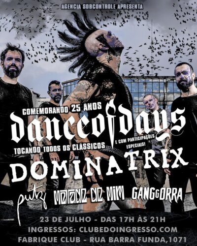 O Dance of Days é a resistência personificada do punk hardcore nacional, materializada em 25 anos de uma intensa história, repleta de vitórias, dramas, tensões e transformações. Da segunda metade da década de 1990 até os dias de hoje, a vocalista Nenê Altro compartilha emoções e lições de vida de peito aberto, olhos nos olhos e em diálogo constante com o íntimo de seu fiel público. É um pouco disso tudo que a banda entregará no show especial do dia 23 de julho em São Paulo, no Fabrique Club. A realização é da Agência Sobcontrole.