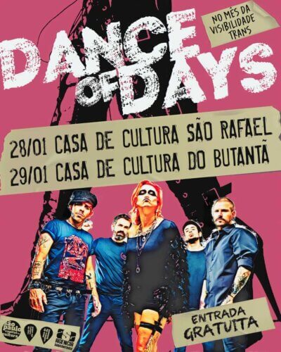 O Dance of Days anuncia dois shows gratuitos em São Paulo na última semana de janeiro, nos dias 28 e 29/01, participando das atividades do Mês da Visibilidade Trans e para divulgar o recém-lançado single Clareia Noite, faixa dois do novo álbum da banda, que chegará ao streaming ainda em 2023.