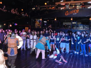 Além dos shows, o festival prometia combates medievais e venda de produtos sobre o tema. De fato, pudemos encontrar tendas e mesinhas com tais mercadorias em um espaço anexo, na lateral da casa: chifres para tomar vinho, runas, acessórios do paganismo e até bonequinhos de cavaleiros medievais, enquanto que os combates aconteceram na pista mesmo, sempre nos intervalos entre as bandas, como aquecimento, com ‘cavaleiros’ usando malhas, capacetes, escudos e espadas ‘lutando’ de modo bem teatral, simples e divertido. Tinha até gente mais empolgada clamando por sangue!