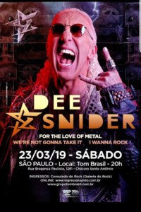 Com produção da Top Link Music, o eterno vocalista e líder do Twisted Sister, Dee Snider, acaba de confirmar seu primeiro show solo no Brasil. O evento acontece no dia 23 de março de 2019, no Tom Brasil, em São Paulo. Por enquanto, essa é a única data agendada no país. Informações sobre ingressos serão divulgados em breve.