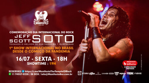 Dois anos atrás, o vocalista americano Jeff Scott Soto se apresentou duas vezes no Brasil, uma com a banda S.O.T.O, e outra prestando tributo ao Queen. Agora, o Manifesto Bar abrirá as suas portas em julho, durante as comemorações no “mês do rock”, para os primeiros shows internacionais desde a chegada da pandemia. “Eu vinha secretamente planejando algo especial para vocês com meus amigos do Manifesto Bar, que me convidaram para ser o primeiro artista internacional de rock a tocar em São Paulo desde o início da pandemia. E vocês não terão apenas um show, mas dois para escolher (espero que venham para os dois!)”, declarou Jeff Scott Soto.