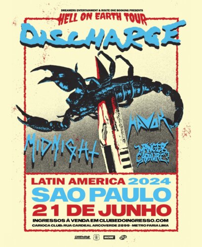 Ingressos continuam à venda: A realização é da Gig Music e Carioca Club em parceria com a Dreamers Entertainment e Route One Booking. Os ingressos antes adquiridos em outra ticketeira, antes da remarcação da data, ainda estão valendo. Nesta terceira passagem pelo Brasil, o Discharge mais uma vez trará suas guitarras cruas, pesadas e distorcidas, junto aos vocais gritados e a atmosfera sombria que impactaram primeiro o punk hardcore da Inglaterra, mas logo eclodiu no mundo – uma sonoridade ríspida que ficaria marcada para sempre. Fundada no condado britânico Staffordshire, em 1977, o Discharge é uma daquelas bandas icônicas do hardcore punk, que a partir do início da década de 1980 inspirou nomes como Death Angel, Anthrax, Sepultura e Ratos de Porão. Além disso, o Discharge é quem criou o d-beat, a nomenclatura de uma batida/ritmo rápido na bateria genuinamente com a chancela da banda inglesa. Formações ao longo de décadas do crust, thrashcore e derivados reverenciam o Discharge. O último álbum de estúdio é ‘End of Days’, lançado mundo afora em 2016 pela Nuclear Blast e que alcançou o 10º lugar no The Official UK Rock Charts e levou o Discharge tocar para multidões esgotadas na América do Norte e na Europa. Bandas convidadasA Havok, de Denver (Colorado, EUA), surgiu em 2004 com um estilo agressivo e de estalar o pescoço que evocou lendas do thrash metal da Bay Area como Exodus, Metallica e Testament. O álbum mais recente é V, de 2020. O Midnight, de Cleveland (EUA), tem destruído o metal/punk underground desde 2002 com seu som ríspido. Construindo uma forte reputação e seguidores fanáticos, a obra mais recente do Midnight, Rebirth By Blasphemy, soa mais completa e estridente do que nunca. A Manger Cadavre? é uma banda de death crust de São José dos Campos, interior de São Paulo. Tendo se apresentado em grandes festivais nacionais como Setembro Negro,Oxigênio Festival, Abril Pro Rock, Virada Cultural Paulista entre outros, a banda atualmente está em tour de lançamento do disco Imperialismo. SERVIÇO Ingressos meia ou promocional: mediante à apresentação da carteira de estudante ou a doação de 1kg de alimento não perecível (exceto sal e açúcar) ou um pacote de absorvente feminino, a ser entregue no dia do show. Classificação: 16 anos Informaçõeswww.instagram.com/discharge.official |