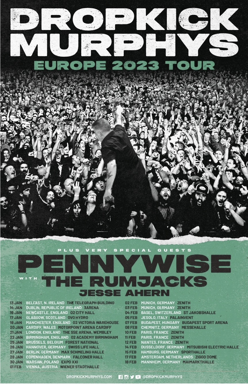 Turnê na EuropaData Cidade LugarJan. 13 Belfast, Northern Ireland The Telegraph Building *Jan. 14 Dublin, Ireland 3Arena **Jan. 16 Newcastle, England O2 City HallJan. 17 Glasgow, Scotland OVO HydroJan. 18 Manchester, England O2 Victoria WarehouseJan. 20 Cardiff, Wales Motorpoint Arena CardiffJan. 21 London, England OVO Arena WembleyJan. 22 Birmingham, England O2 Academy BirminghamJan. 24 Esch-sur-Alzette, Luxembourg RockhalJan. 25 Brussels, Belgium Forest NationalJan. 26 Hanover, Germany Swiss Life HallJan. 27 Berlin, Germany Max Schmeling HalleJan. 28 Copenhagen, Denmark Falconer HallJan. 30 Warsaw, Poland Expo XXIFeb. 1 Vienna, Austria Wiener StadthalleFeb. 2 Munich, Germany ZenithFeb. 3 Munich, Germany ZenithFeb. 4 Basel, Switzerland St JakobshalleFeb. 5 Jesolo, Italy PalaInventFeb. 7 Budapest, Hungary Budapest Sport ArenaFeb. 8 Chemnitz, Germany MessehalleFeb. 10 Paris, France Le ZénithFeb. 11 Paris, France Le ZénithFeb. 12 Nantes, France Le ZenithFeb. 14 Dusseldorf, Germany Mitsubishi Electric HalleFeb. 15 Hamburg, Germany SporthalleFeb. 17 Amsterdam, Netherlands Ziggo DomeFeb. 18 Mannheim, Germany MaimarkthalleTodos os espetáculos com convidados muito especiais Pennywise mais The Rumjacks e Jesse Ahern, a menos que indicado o contrário *Com The Rumjacks **Com The Scratch e The RumjacksThis Machine…Theater TourData Cidade LugarSep. 16 West Springfield, MA The Big E 2022 *Oct. 20 Concord, NH Capitol Center for the ArtsOct. 21 Providence, RI Veterans Memorial AuditoriumOct. 22 Atlantic City, NJ Caesars Atlantic City – Circus MaximusOct. 24 Brooklyn, NY Kings TheatreOct. 25 Washington, DC Lincoln TheatreOct. 27 North Charleston, SC North Charleston Performing Arts CenterOct. 28 Raleigh, NC Raleigh Memorial Auditorium at Duke Energy Center for the Performing ArtsOct. 29 Cincinnati, OH The Andrew J Brady Music CenterOct. 30 Greensburg, PA (Pittsburgh) Palace TheatreNov. 1 Tulsa, OK Tulsa TheatreNov. 2 Omaha, NE The Holland CenterNov. 3 Denver, CO Paramount TheatreNov. 5 Phoenix, AZ Orpheum TheatreNov. 6 Silverado, CA Oak Canyon Park (Punk In The Park) *Nov. 8 Los Angeles, CA Orpheum TheatreNov. 9 Oakland, CA Fox TheaterNov. 10 Monterey, CA Golden State TheatreNov. 11 Reno, NV Silver Legacy Resort & Casino – Grande Expo HallNov. 13 Seattle, WA Moore TheatreNov. 16 Minneapolis, MN State TheatreNov. 17 Des Moines, IA Hoyt Sherman Place TheaterNov. 18 Chesterfield, MO (St. Louis) The FactoryNov. 19 Nashville, TN Ryman Auditorium* Festival / data de feira, show completoVeja a performance acústica do Dropkick Murphys no Paste Session de 29 de agosto aqui.Dropkick Murphys – This Machine Still Kills Fascists são: Ken Casey (vocal), Tim Brennan(guitarra,assobio, accordeon, piano, vocal), Jeff DaRosa (guitarra, banjo, mandolin, vocal), Matt Kelly (bateria, percussão, and vocal), James Lynch(guitarra and vocal), Kevin Rheault (baixo).Siga Dropkick Murphys:Website: www.DropkickMurphys.comFacebook: www.facebook.com/DropkickMurphysInstagram: www.instagram.com/dropkickmurphysTwitch: www.twitch.tv/dropkickmurphysTwitter: www.twitter.com/DropkickMurphysYouTube: www.youtube.com/DropkickMurphys