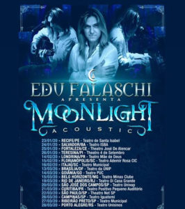Edu Falaschi acaba de anunciar as datas da “Moonlight Celebration Tour” com shows em teatros por todo o Brasil. O show revisitará as principais músicas de sua carreira com o Angra, Almah, Symbols, entre outros. Nessas apresentações, Edu irá contar com músicos como Tiago Mineiro, Ricardinho Paraíso e Wagner Barbosa para mostrar como as músicas foram compostas.
