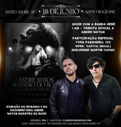 Após exibir o segundo episódio do documentário “Andre Matos – Maestro do Rock” no Summer Breeze Brazil e no Teatro Safra, em São Paulo, o Episódio 2 ganha exibição especial no Santo Rock Bar, em Santo André, no dia 18 de junho (domingo). Além da exibição do filme e do show com a banda Here I Am (tributo oficial ao Andre Matos), que vai tocar o álbum Angels Cry, do Angra, na íntegra, teremos também a participação mais do que especial do guitarrista Yves Passarel (Capital Inicial/ex-Viper) e do baterista Guilherme Martin (Viper/Toyshop). O diretor Anderson Bellini estará presente e vai conversar com o público, além de uma exposição de itens pessoas do Andre e venda de merchandising oficial do Documentário.