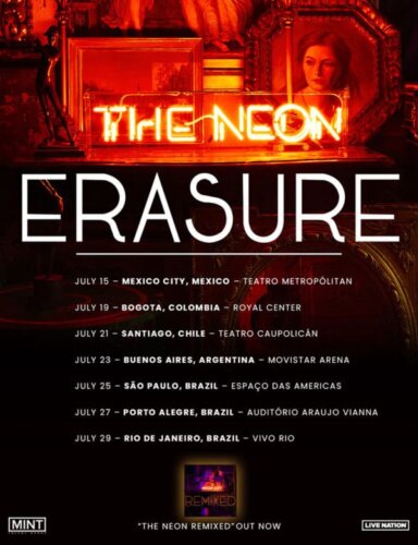 Depois de esgotar os shows no Reino Unido, ERASURE (Andy Bell e Vince Clarke) anunciaram que irão trazer a Neon Tour pra o México, Colômbia, Chile, Argentina, e Brasil em julho de 2022.