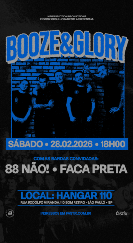 Ingressos: fastix.com.br/events/booze-glory-uk-em-sao-paulo A apresentação tem realização da ND Productions em parceria com a Fastix e integra a turnê mundial do Booze & Glory em divulgação do novo álbum, Whiskey, Tango & Foxtrot. Faca Preta, banda do selo Repetente Records (criado a administrado por Badauí e Phil Fargnoli do CPM 22 junto ao diretor artístico Rick Lion), uma das formações mais ativas e relevantes do street punk nacional da atualidade, que divulga o EP EP ‘Fogo no Sistema’. O Faca Preta comenta sobre o convite. “É uma enorme satisfação tocar com uma banda do porte do Booze and Glory nesse momento. Uma banda, que assim como o Faca Preta, surgiu dessa nova safra dentro do street punk, e se destacou muito no cenário mundial e acabou influenciando em nosso som também. Nesse show vamos apresentar músicas do nosso último EP, Fogo no Sistema, e músicas dos discos anteriores”. A 88 Não!, do subúrbio de Mauá (São Paulo) e com influências de Cock Sparrer, Dropkick Murphys e Sham 69, é outro novo relevante do street punk brasileiro. O álbum mais recente da banda é Cinza, de 2025, com canções diretas sobre mazelas, a falta de empatia entre as pessoas, a opressão do capitalismo e o espectro da cor cinza no cotidiano de sobrevivência na cidade. O 88 Não! completou 25 anos de atividade ininterrupta e a participação neste evento é emblemática. “Vamos passear um pouco por todas as fases, mas focando principalmente no último disco, que vem tendo um feedback legal. Além disso, temos preparado um momento especial em que teremos como convidados um naipe de metais, pra fazermos um bloco de ska”, revela a banda. Booze & GloryFormado em Londres, o Booze & Glory é um dos nomes mais reconhecidos do street punk/Oi! contemporâneo, com uma trajetória marcada por letras diretas, refrões fortes e uma estética profundamente conectada à cultura urbana e operária britânica. Liderada pelo vocalista Mark RSK, a banda se consolidou como uma referência do gênero ao longo de mais de uma década de atividade. Desde o álbum de estreia Always On The Wrong Side (2010), o grupo construiu uma discografia consistente, com lançamentos como As Bold As Brass, Mad World, Hurricane e Chapter IV, além de uma intensa agenda de turnês internacionais. O Booze & Glory já se apresentou em grandes festivais europeus, como o Rebellion Festival (Reino Unido), Punk Rock Holiday (Eslovênia) e Mighty Sounds (República Tcheca), e realizou turnês extensas pela Europa, América do Norte, América Latina e Japão. Um dos diferenciais da banda é sua forte relação com a cultura do futebol, elemento recorrente tanto nas letras quanto na identidade visual do grupo. O Booze & Glory é frequentemente associado ao universo das arquibancadas inglesas, aos cânticos de torcida e ao espírito coletivo que aproxima o punk Oi! da cultura futebolística. Gravado em três países (Itália, Polônia e México), o novo álbum Whiskey, Tango & Foxtrot reafirma o compromisso da banda com este som autêntico das ruas, com guitarras incisivas e batidas aceleradas. As primeiras singles lançadas, Boys Will Be Boys, Brace Up e Mad World, destacam-se como hinos fáceis de cantar em shows e clubes, alinhando o disco com a tradição do punk britânico de envolver o público na performance. |
