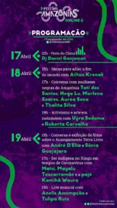 O Festival AmazôniaS Online chega neste fim de semana, de 17 a 19 de abril para pensar possibilidades de resistência e de vida em tempos de pandemia. Esse intercâmbio entre ativistas e artistas do Norte do país e de São Paulo trará rodas de conversa, shows e exibição de filmes, com transmissão ao vivo pelas redes sociais.