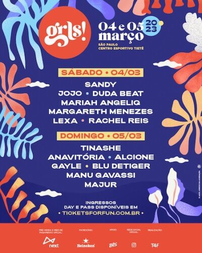 O Festival GRLS! existe para amplificar o trabalho de mulheres, as suas visões de mundo e mensagens, além de querer inspirar a indústria da música e do entretenimento na busca por igualdade, diversidade e inclusão. Marcada para os dias 4 e 5 de março de 2023, no Centro Esportivo Tietê, em São Paulo, a segunda edição do evento acaba de anunciar três novos nomes em sua programação, ANAVITÓRIA, Majur e Lexa, e também revelou a divisão do line-up por dia. As artistas se unem a Alcione, Sandy, Tinashe, Mariah Angeliq e JoJo, que já estavam confirmadas como atrações deste ano, enquanto Ludmilla precisou cancelar a sua participação por questões logísticas. Com isso, a Time For Fun — idealizadora do festival — dá início à abertura das vendas por dia. Os ingressos podem ser adquiridos pelo site ticketsforfun.com.br (com taxa) ou pela bilheteria oficial (sem taxa; no Teatro Renault. Av. Brigadeiro Luís Antônio, 411 – República).