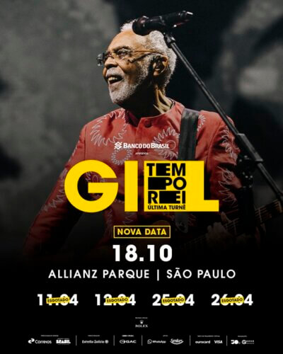 Quando migrou para São Paulo, em 1965, Gilberto Gil ainda não se dedicava inteiramente à música, mas foi na cidade que ele começou a mostrar o seu talento para todo o Brasil, ao se destacar no programa O Fino da Bossa, exibido pela Record e apresentado por Elis Regina. A turnê TEMPO REI marca o retorno de Gil — 60 anos depois — para a capital paulista, e de forma emblemática, com quatro noites (11, 12, 25 e 26 de abril) com sold out de ingressos e 200 mil pessoas no Allianz Parque, na Zona Oeste de São Paulo, contemplando a arte de Gil em 2 horas e 30 minutos de show. Agora, a cidade que foi palco de tantos momentos especiais da carreira de Gil, ganha mais uma oportunidade de celebrar sua musicalidade, no dia 18 de outubro de 2025, quando ele retorna ao Allianz Parque com um show extra da tour. Clientes do Banco do Brasil com cartões Ourocard Visa têm direito à pré-venda de entradas com benefícios exclusivos a partir das 10h do dia 12 de maio. Já a venda geral começa ao meio-dia, do dia 15 de maio, ambas no site da Eventim (acesse aqui).