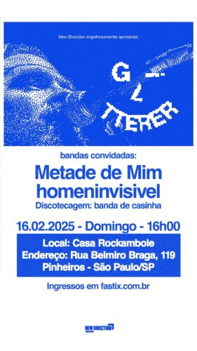 Ingressos no 2º lote: https://fastix.com.br/events/glitterer-eua-em-sao-paulo. Por anos, Glitterer foi Ned Russin (vocalista e baixista, Tittle Fight) e seu laptop. Como banda, lançou em 2024 o empolgante Rationale, uma sonoridade única entre o post-hardcore e power pop, uma ótima pedida para fãs de Basement, Citzen ou Fiddlehead. Bandas convidadasA cada lançamento, o Metade de Mim (www.instagram.com/mtddemim) aperfeiçoa e define sua identidade sonora e lírica. Cada palavra da letra é pontual para o contexto e entendimento da mensagem completa. O último lançamento foi o single Pressentimento, que reflete como a intuição pode ser o lugar para ser o port0-seguro contra decepções ou problemas do dia a dia. O quinteto paulista de emo/rock alternativo formado em 2019 que, apesar de pouco mais de três anos em atividade, já formou um relativo público com singles e, agora, dois EPs. O som do Metade de Mim é recomendo para fãs de Zander, Terno Rei, Radical Karma e menores atos. Homeninvisivel (www.instagram.com/homeninvisivel) é uma banda paulistana formada em meados de 2017, que traz em sua sonoridade musical elementos de gêneros como o shoegaze e o real emo. Hoje, a banda abraça o real emo e o post-hardcore, como pode ser conferido no single mais recente, Dissolver II. Glitterer e a carreira em ascensãoNed Russin, o vocalista e baixista, que antes era o faz tudo Glitterer, começou a banda lá em 2017, um pouco depois da primeira pausa do Tittle Fight. Foram quatro discos produzidos por ele mesmo, alguns músicos convidados e turnês. Tanto o disco de estreia, Looking Through The Shades (2019), como o sucessor, Life Is Not A Lesson (2021), deixaram marcas na indústria fonográfica e em veículos de imprensa como The A.V. Club, Spin, Stereogum e uma pequena chamada no Washington Post, que descreveu a música de Glitterer como “explosões melódicas tão eficientes que quase parecem absurdos” e referindo-se a uma seção da música “Fire” como “um momento impressionante”. De 2021 a Glitterer vira, de fato, a banda de quatro pessoas que é hoje e que vem ao Brasil: Ned Russin (baixo e vocal), Nicole Dao (teclado), Jonas Farah (bateria) e Connor Morin (guitarra). Entre as turnês subsequentes de destaque, tem a temporada na primavera de 2023 com Tigers Jaw e uma turnê de verão como atração principal, que atraiu multidões. Já Rationale, álbum que a banda traz a turnê a São Paulo, enlouqueceu a cena post hardcore, imerso em muitas correntes de indie rock e pós-punk/hardcore, com influência do eterno Fugazi e referências a alguns dos grupos britânicos dos anos 70 e 80, como Wire e Siouxsie e The Banshees. SERVIÇO Glitterer dia 16/02 em São Paulo Bandas convidadas: Metade de Mim e homeninvisivel Data: 16 de fevereiro de 2025 (domingo) Horário: 16h (abertura da casa) Local: Casa Rockambole (Rua Belmiro Braga, 119 – Pinheiros, São Paulo – SP) Ingressos: https://fastix.com.br/events/glitterer-eua-em-sao-paulo. Valores: R$ 130,00 (2º lote, meia-entrada e meia solidária) e R$ 260,00 (2º lote, inteira) Mais informaçõeshttps://www.instagram.com/glitterererer |