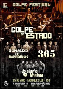 O Rock nacional está em festa; no dia 05 de maio acontece o 1º Golpe Festival, com shows das bandas Salário Mínimo, 365, Ronaldo e os Impedidos e o Golpe de Estado. Essa grande celebração acontece no Fabrique Club (R. Barra Funda, 1071, Barra Funda, São Paulo – a 100 metros da antiga Clash Club!), a partir das 15h.