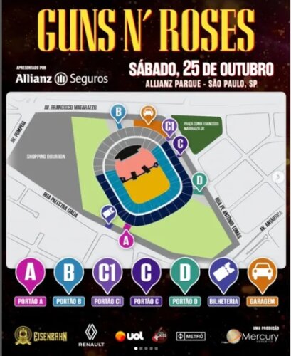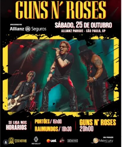 O momento mais aguardado pelos fãs de rock está chegando: Guns N’ Roses volta a São Paulo neste sábado, 25 de outubro, para um show histórico no Allianz Parque! A noite promete ser inesquecível, com um repertório repleto de clássicos e a energia inconfundível de Axl Rose, Slash e Duff McKagan no palco.