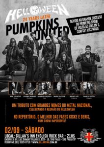 Devido ao grande sucesso de público do primeiro show, o “Pumpkins United Helloween Tribute” retorna ao Gillans Inn English Rock Bar, em São Paulo, para mais um show recheado de clássicos das eras Derris e Kiske, tocando o melhor das duas fases, e com algumas novidades no set list, em relação ao primeiro show. O evento acontece no dia 2 de setembro (sábado), à partir das 21h, com ingressos custando apenas 20 reais.
