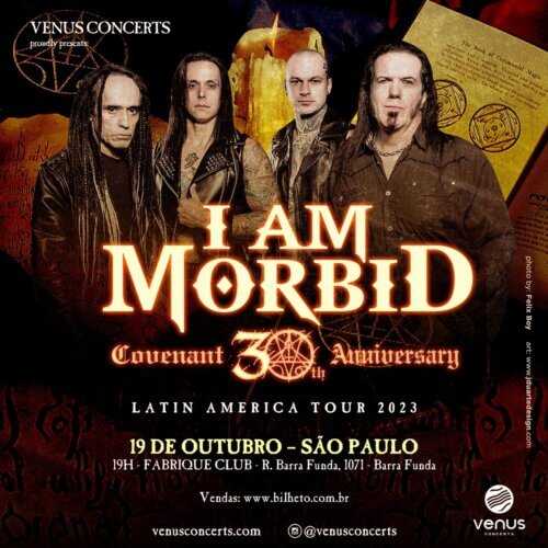 A sensação do death metal mundial I Am Morbid, que conta com dois músicos lendários do Morbid Angel, Dave Vincent (baixo e vocal) e Pete Sandoval (bateria), volta ao Brasil para shows em São Paulo (19/10, Fabrique Club) e Brasília (20/10, Toinha Brasil Show). A realização é da Vênus Concerts, a produtora que viabilizou o vitorioso e concorrido giro do I Am Morbid em 2022. Covenant, o terceiro disco do Morbid Angel, era lançado há 30 anos. À época, em 1993, e ainda hoje, é um álbum seminal do death metal, que impactou o mundo da música pesada com 10 faixas rápidas e agressivas. As apresentações do I Am Mobid no Brasil em 2023 trarão músicas do citado álbum Covenant e outros clássicos do Morbid Angel. Covenant foi lançado em junho de 1993 pela Earache Records na Europa, pela Giant Records na América do Norte e, posteriormente, ganhou mais versões ao redor do mundo. O álbum, constantemente apontado como um dos clássicos absolutos do metal pesado, levou o death metal à MTV: teve grande exposição na Headbangers Ball da MTV, bem como o videoclipe de ‘God of Emptiness’ que apareceu no desenho Beavis and Butt-head. Naquela época, caiu na estrada ao lado de bandas como Black Sabbath e Motorhead. Em 2017, a Rolling Stone nomeou-o o 75º melhor álbum de metal de todos os tempos. Completam a banda os guitarristas Bill Hudson (brasileiro radicado nos EUA, com passagens pelo Circle II Circle, Northtale, Doro, Trans Siberian Orchestra, Vital Remains, entre outras) e Richie Brown (tocou no Trivium, em 2001). SERVIÇO I Am Morbid em Brasília |