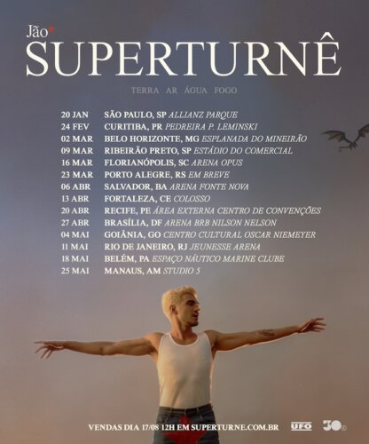 “Esse é um álbum finamente pensado para ser gritado ao vivo, nos maiores palcos do país. Juntos”. É dessa forma que Jão define o quarto disco de sua carreira, SUPER, lançado na última segunda-feira (14 de agosto). Uma parceria do cantor com a 30e e a UFO será responsável por rebobinar a quadrilogia fonográfica do artista e transformá-la em um mega espetáculo que passará pelas principais arenas do Brasil. A estreia da turnê SUPER está marcada para o dia 20 de janeiro, no Allianz Parque, em São Paulo. Na sequência, a tour tem passagem confirmada pelas seguintes cidades: Curitiba, no dia 24 de fevereiro; Belo Horizonte, no dia 2 de março; Ribeirão Preto, 9 de março; Florianópolis, no dia 16 de março; Porto Alegre, no dia 23 de março; Salvador, no dia 6 de abril; Fortaleza, no dia 13 de abril; Recife, no dia 20 de abril; Brasília, no dia 27 de abril; Goiânia, no dia 4 de maio: Rio de Janeiro, no dia 11 de maio; Belém, no dia 18 de maio; Manaus, no dia 25 de maio. A venda de ingressos para todas as apresentações começa nesta quinta-feira, 17 de agosto, ao meio-dia, no site da Eventim (acesse aqui).