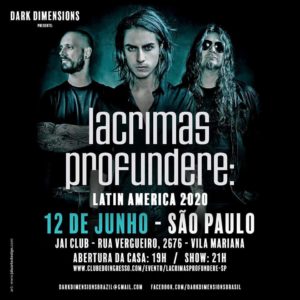 Com produção da Dark Dimensions, os alemães do Lacrimas Profundere acabam de confirmar apresentação única em São Paulo, na Jai Club, no dia 12 de junho de 2020. Apesar de já terem tocado na América do Sul, esta é a primeira e provavelmente a última vez que Julian Larre (vocal), Oliver Nikolas (guitarra), Ilker Ersin (baixo) e Dominik Scholz (bateria) encontrarão os fãs brasileiros, pois ao que tudo indica esta será uma turnê de despedida da banda.
