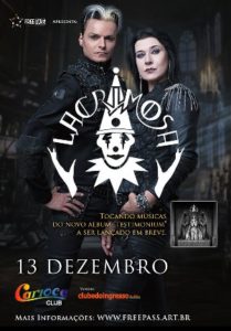 A banda alemã Lacrimosa retornará ao Brasil para um show único, que acontecerá no dia 13 de Dezembro (Quarta-feira), a partir das 20h no Carioca Club, em São Paulo (SP). A banda vem promovendo seu mais recente álbum “Testimonium”, que será lançado em breve ainda este ano. O grupo promete um show completamente novo e cheio de surpresas, e promete agradar os fãs de gothic metal, darkwave e metal sinfônico.
