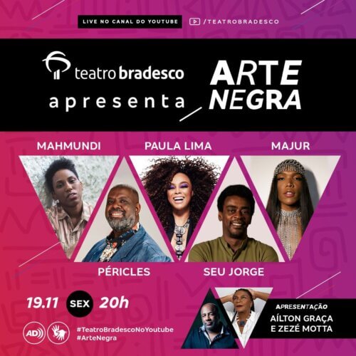 Visando relembrar a importância de refletir sobre a posição dos negros na sociedade, o Teatro Bradesco realiza, no próximo dia 19 de novembro, a live “Arte Negra”. O evento contará com a participação de nomes consagrados como Mahmundi, Paula Lima, Péricles, Seu Jorge e Majur.