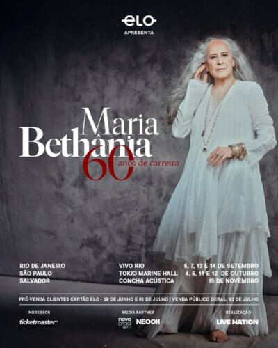 Maria Bethânia completa 60 anos de carreira e anuncia apresentações comemorativas em São Paulo, Rio de Janeiro e Salvador. Apresentados por Elo, os shows estreiam no Rio de Janeiro, nos dias 06, 07, 13 e 14 de setembro, no Vivo Rio, seguindo para São Paulo nos dias 04, 05, 11 e 12 de outubro, no Tokio Marine Hal e no dia 15 de novembro, em Salvador, na Concha Acústica.