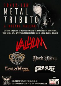O Deco Rock Bar, em Guarulhos, recebe no próximo dia 10 de dezembro, domingo, a partir das 13 horas, o Metal Tributo, em memória aRosana Galloni. O evento é beneficentee toda a renda arrecadada com a portaria será revertida para o tratamento do grande amigo Marcos Braglia, portador de Esclerose Lateral Amiotrópica – ELA. Os ingressos custam R$10,00.