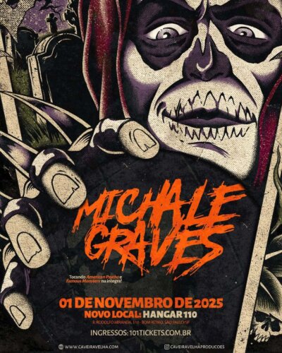 Nesta nova turnê pela América do Sul, que inclui shows em mais países como Uruguai, Argentina, Chile, Colômbia, Peru e Equador, para uma série de shows em que apresenta, na íntegra, Michale Graves canta músicas de dois álbuns fundamentais de sua ex-banda, o Misfits: American Psycho (1997) e Famous Monsters (1999). Na capital São Paulo, após sold out, o show foi transferido para o Hangar 110 (R. Rodolfo Miranda, 110 – Bom Retiro, São Paulo/SP) e um último lote de ingressos ainda está disponível. Adquira sua entrada aqui. As outras datas da turnê são Brasília (23/10, no UK Music Hall), Goiânia (24/10, De Leon Music Club), Belo Horizonte (25/10, Caverna Rock Club), Rio de Janeiro (26/10, Experience Music), Porto Alegre (29/10, Espaço Marin – novo local), Florianópolis (30/10, John Bull Floripa) e Curitiba (31/10, Basement Cultural). Os ingressos para todos os shows estão à venda no site da tiqueteira 101 Tickets. Durante o período em que foi frontman do Misfits, Graves ajudou a renovar o som e a estética da banda, unindo a energia do punk clássico a uma abordagem mais melódica e cinematográfica. Músicas como “Dig Up Her Bones”, “Scream!”, “American Psycho” e “Saturday Night” tornaram-se hinos de uma geração que descobriu o horror punk nos anos 1990. Lançado em 1997, American Psycho marcou o renascimento do Misfits após mais de uma década de hiato. Com Michale Graves assumindo os vocais, a banda apresentou uma sonoridade mais polida, sem perder a essência agressiva e sombria do horror punk. Faixas como “Dig Up Her Bones”, “American Psycho” e “Shining” se tornaram clássicos instantâneos, unindo melodias acessíveis, refrões memoráveis e letras inspiradas em filmes de terror. Dois anos depois, o Misfits consolidaria essa nova fase com Famous Monsters (1999), álbum que expandiu ainda mais a identidade do grupo. O disco trouxe canções icônicas como “Scream!”, “Saturday Night” e “Descending Angel”, que misturam o espírito rebelde do punk com um senso teatral característico da era Graves. Mais informações: @caveiravelhaproducoes |