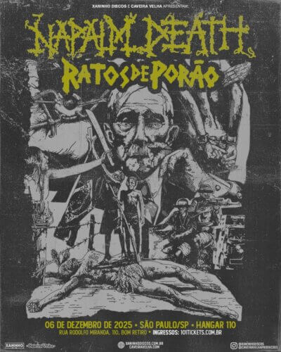 A Xaninho Discos junto à Caveira Velha Produções trazem a icônica banda inglesa de grindcore Napalm Death a São Paulo, no dia 5 de dezembro de 2025. Será a única apresentação no Brasil em meio à nova turnê pela América Latina. A apresentação será no Hangar 110 e terá o Ratos de Porão como banda convidada em uma noite histórica. Ingressos: https://101tickets.com.br/events/details/Napalm-Death-e-Ratos-de-Porao-em-Sao-Paulo O Napalm Death surgiu em 1981, no vilarejo de Meriden, próximo a Birmingham (Inglaterra), e atravessa décadas como uma das formações mais influentes do mundo com sua sonoridade pesada e contestadora. Guitarras distorcidas, blast beats frenéticos, vocais guturais e letras com forte viés sociopolítico são a verve da banda. Até o momento, já lançou 16 álbuns de estúdio. O lançamento mais recente do Napalm Death é o álbum colaborativo com os Melvins, intitulado Savage Imperial Death March, lançado em fevereiro de 2025. Já solo, lançaram o EP Resentment Is Always Seismic – A Final Throw of Throes, em 2022. Ao vivo, o Napalm Death é historicamente avassalador. Mark ‘Barney’ Greenway (vocais) John Cooke (guitarra), Shane Embury (baixo) e Danny Herrera (bateria) tomam conta do palco com força e peso, combinando clássicos como “Prison Without Walls” e “You Suffer” com faixas mais recentes, comprovando sua evolução sem perder a essência grindcore. Com razão, as apresentações da banda inglesa são descritas por fãs e crítica especializada como “um ataque sensorial” pesado, direto e intenso. Em uma recente entrevista ao site espanhol Rafa Basa, Barney falou do repertório do Napalm Death ao vivo, que busca trazer novidades aos fãs: “Sempre tentamos fazer um repertório diferente. Eu me canso de ver bandas tocando a mesma coisa ano após ano, então nos limitamos às músicas que as pessoas querem ouvir, os clássicos, se você quiser chamá-los assim, e também tentamos introduzir coisas diferentes. Basicamente é sempre um repertório diferente.“ Ratos de Porão – O Ratos de Porão é uma banda brasileira de punk crossover formada em novembro de 1981, durante a explosão do movimento punk paulista. Seu primeiro disco, Crucificados pelo Sistema, saiu em 1984 e tinha músicas que se tornaram hits instantâneos como a própria Crucificados, Agressão Repressão e Morrer. São conhecidos internacionalmente, tendo feito turnês pela América Latina, Europa e América do Norte. Atualmente estão se apresentando ao vivo com sua turnê de 40 anos, que marca também o lançamento do álbum Necropolítica, feito durante a pandemia SERVIÇONapalm Death + Rato de Porão em São PauloData: 6 de dezembro de 2025 Horário: 18h (abertura da casa) Local: Hangar 110 (rua Rodolfo Miranda, 110, Bom Retiro – São Paulo/SP) Ingressos: https://101tickets.com.br/events/details/Napalm-Death-e-Ratos-de-Porao-em-Sao-Paulo |