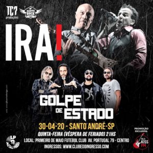 No mês que vem o Ira! se apresenta no ABC ao lado do Golpe de Estado. O show acontece no dia 30/04 (quinta-feira, véspera de feriado!) no Clube 1º de Maio (Av. Portugal, 79, Centro, Santo André – SP), a partir das 21h.