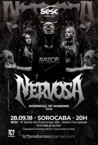 Depois de mais uma turnê de sucesso na Europa – passando por grandes festivais de verão – e shows com o Destruction no Brasil, as meninas da Nervosa tocam amanhã (28/09), a partir das 20h, no Sesc Sorocaba (Rua Barão de Piratininga, 555, Jd. Faculdade). A entrada é gratuita, mas atenção: Os ingressos terão que ser retirados uma hora antes do show!