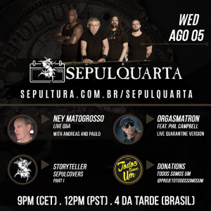 “ Estou muito feliz em anunciar que teremos uma sessão de perguntas e respostas ao vivo com uma lenda viva, o incrível Ney Matogrosso. Um dos pioneiros do rock no Brasil com sua banda Secos & Molhados, ele é a voz mais reconhecida na música brasileira, estamos realmente honrados! Além disso, teremos outra lenda viva tocando conosco, nosso mestre e irmão Phil Campbell, do todo-poderoso Motörhead! Será uma bela e histórica performance de Orgasmatron! Não perca!” – afirma Kisser.