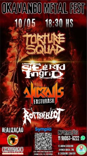 A segunda edição do Okavango Metal Fest acontece no dia 10 de maio, no EC Jardim Casqueiro, em Cubatão/SP, um espaço com infraestrutura completa para receber os fãs com conforto e segurança. Mantendo o compromisso com a democratização da cultura, o festival contará com diversas atrações, incluindo flash tattoo, expositores de merchandising e roupas alternativas, sorteios de brindes e um bar abastecido com bebidas e comidas a preços acessíveis. A acessibilidade também é um dos pilares do festival, com a casa situada em um ponto estratégico da cidade, próxima ao trajeto das principais linhas intermunicipais e de fácil acesso para quem vem de São Paulo e/ou do ABC. SERVIÇO: Okavango Metal Fest 2025 Bandas: Rottenblot, Siegrid Ingrid, Andralls e Torture Squad Data: 10 de maio de 2025 Local: Av. Brasil, 296 – Jardim Casqueiro, Cubatão/SP Abertura das portas: 18h30 Previsão de término: 01h (dia seguinte) Assessoria de Imprensa: JZ Press Ingressos online via Sympla: https://www.sympla.com.br/evento/okavango-metal-fest-2025/2819286 Parcelamento disponível via cartão de crédito/débito. Outros canais de venda: WhatsApp: (11) 98053-6222 Instagram: @okavangocultural Pagamentos via: PIX, transferência ou dinheiro – sem taxa de conveniência Infraestrutura: Espaço climatizado | Bar e cozinha completos | Alvará de funcionamento | Localização privilegiada Classificação etária: Crianças a partir de 7 anos podem entrar acompanhadas dos pais. Crianças até 12 anos não pagam ingresso. Menores de idade devem estar acompanhados de um responsável legal com documento de identificação. Sobre as bandas: Rottenblot (banda convidada) – Formada em 2019 em Volta Redonda/RJ, a banda aposta em um thrash metal moderno com influências de Revocation, The Black Dahlia Murder, Gojira e Lamb of God. Com os singles “High in Hell” e “Intolerância” já disponíveis, estão finalizando seu primeiro EP. Integrantes: Felipe Freitas (vocal), Daniel Ghazzhaoui (guitarra), Bruno Procópio (baixo) e Eduardo Prado (bateria). Siegrid Ingrid – Uma verdadeira lenda do underground brasileiro que alcançou grande sucesso nos anos 90 com os clássicos “Pissed-Off” (1995) e “The Corpse Falls” (1999). Após um hiato, retornaram com força total em 2019, lançando os álbuns “Back From Hell” (2023) e o ao vivo “Massacre In Lorena” (2024). Atualmente formada por M.Punk (vocal), André Gubber (guitarra), Luiz Berenguer (baixo) e Romulo Minduim (bateria), a banda entrega um show visceral e brutal. Andralls – Formada em 1998 em São Paulo, a banda é referência no thrash metal nacional com seu estilo próprio batizado de Fasthrash. Com álbuns como “Force Against Mind” (2003), “Andralls” (2009) e “Bleeding for Thrash” (2019), e turnês por América do Sul e Europa, segue ativa com o poderoso “Universal Collapse” (2024). Line-up: Alex Coelho (vocal/guitarra), Guilherme Goto (guitarra), Renato Carvalho (baixo) e Marcos Luz (bateria). Torture Squad – Veteranos com mais de três décadas na estrada, o Torture Squad mistura death e thrash metal com letras intensas sobre violência e caos social. Com formação atual composta por Mayara “Undead” Puertas (vocal), Rene Simionato (guitarra), Castor (baixo) e Amilcar Christófaro (bateria), a banda traz no repertório o peso do disco “Devilish” (2023) e grandes clássicos. Em 2025, estarão no palco do Wacken Open Air, o maior festival de metal do mundo. Sobre o Okavango Cultural: Fundado em 2023 pelo Empreendedor Social Alexandre Hashimoto, o projeto tem como missão fortalecer a cena musical da Baixada Santista, promovendo eventos acessíveis e incentivando a economia criativa em regiões periféricas. A médio e longo prazo, o objetivo é consolidar a região como destino cultural por meio da música, teatro, cinema, esportes e outras expressões artísticas. Conheça mais nas palavras de seu fundador: https://youtu.be/zELNWU5oQ9M Links Relacionados: https://www.instagram.com/okavangocultural