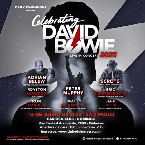 Ao lado de Adrian Belew (guitarra/David Bowie, King Crimson, NIN) e dos renomados músicos Royston Langdon (baixo/Spacehog), Matt McJunkins (baixo/A Perfect Circle), Scrote (guitarra/Sting, Todd Rundgren), Jeff Friedl (bateria/Devo, A Perfect Circle), Ron Dziubla (saxofone/Jon Batiste, Joe Bonamassa) e Eric Schermerhorn (guitarra/David Bowie, Iggy Pop). Peter Murphy apresentará no Carioca Club Pinheiros, em São Paulo, dia 16 de julho, interpretações dos maiores sucessos de David Bowie com ênfase especial na sua era proto-punk de Ziggy Stardust, os álbuns da trilogia de Berlim (“Low”, “Heroes” e “Lodger”) e seus últimos anos de parceria com o líder do NIN, Trent Reznor. Venda online através do Clube do Ingresso em https://www.clubedoingresso.com/evento/davidbowie-celebrating “É uma surpresa ser convidado para celebrar o legado de Bowie nessa turnê e ao lado desses grandes músicos”, disse Peter Murphy. “Estou muito ansioso para cair na estrada e prestar essa homenagem”, finalizou. Sobre a relação dos músicos com David Bowie. Andrew Belew tocou guitarra com o renomado músico na turnê “Isolar II”, em 1978, gravou as guitarras no álbum “Lodger”, de 1979, e excursionou na turnê “Sound+Vision”, em 1990. Eric Schermerhorn, por sua vez, foi guitarrista e backing vocal na turnê em 1991 com o grupo de Hard Rock idealizado por Bowie, o Tin Machine. Os outros artistas não têm uma conexão direta com David Bowie, mas Peter Murphy – junto ao Bauhaus – fez um cover de “Ziggy Stardust” em um single de 1982, transformando-o em um hit para uma nova geração. “Estou emocionado em homenagear David novamente com este novo e explosivo grupo de artistas e músicos verdadeiramente únicos e brilhantes”, disse Scrote. “Este novo show representa os dois lados de Bowie. Com Peter Murphy, temos o barítono sombrio envolto em mistério e maravilha. Com Adrian Belew, o melodioso tenor cantando alegremente as favoritas de Bowie enquanto entrega a guitarra de outro mundo pela qual ele é reverenciado”, enfatizou. Outras encarnações da Celebrating David Bowie Tour ocorreram no passado, como, por exemplo, uma liderada por Scrote (desde 2017) e Todd Rundgren (2022), atingindo cerca de 17 países e contando com participações especiais de nomes como: Sting, Gary Oldman, Thomas Dolby, Joe Bonamassa, Seal, Perry Farrell, Kate Pierson do B-52, Ewan McGregor, Simon Le Bon, Gavin Rossdale, La Roux, Joe Elliott do Def Leppard, Tony Hadley do Spandau Ballet, Corey Taylor, Ian Astbury, Darren Criss, The Tubes’ Fee Waybill, Living Colour, The London Community Gospel Choir e The Harlem Gospel Choir. SERVIÇO: CELEBRATING DAVID BOWIE EM SÃO PAULO Data: 16 de Julho (Domingo) Setores / Preços (1º Lote): Pista – Meia-entrada R$ 160,00 Venda online através do Clube do Ingresso em https://www.clubedoingresso.com/evento/davidbowie-celebrating Pontos de Venda (sem taxa de serviço – pagamento em dinheiro): Carioca Club Pinheiros Flyer por João Duarte (@jduarte_design) Links Relacionados: https://www.facebook.com/darkdimensionsprodutora |